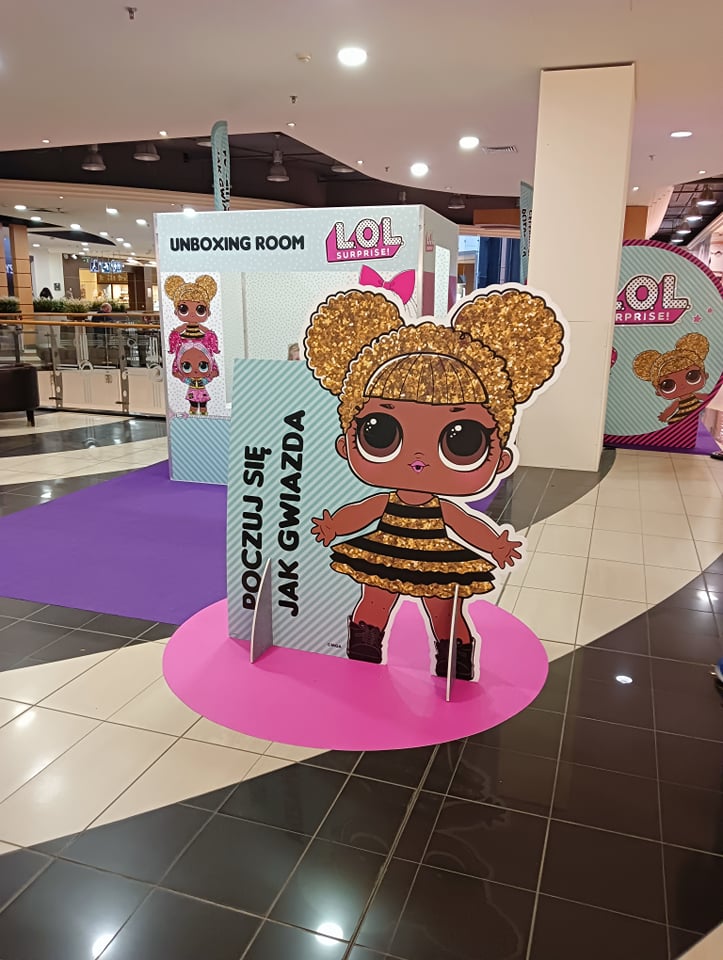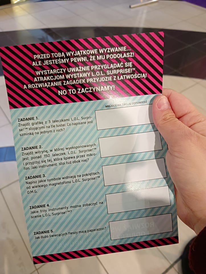 Dostajemy formularz, na którym mamy 5 zadań, odpowiedzi wpisujemy w odpowiednim okienku. Żeby odkryć wszystkie tajemnice odwiedzamy kolejne stoiska. Na niektórych przygotowane są odpowiedzi do zadań, inne pełnią funkcję przede fajnego tła do selfie. Można sprawdzić swoje umiejętności na scenie koncertowej, wskoczyć na huśtawkę-kulę lub zapozować przy różowym aucie lub w ogromnym pudełku od lalki. W dwóch miejscach można także obejrzeć galerię laleczek, akcesoriów, samochodów i domków dla laleczek L. O. L. Surprise.